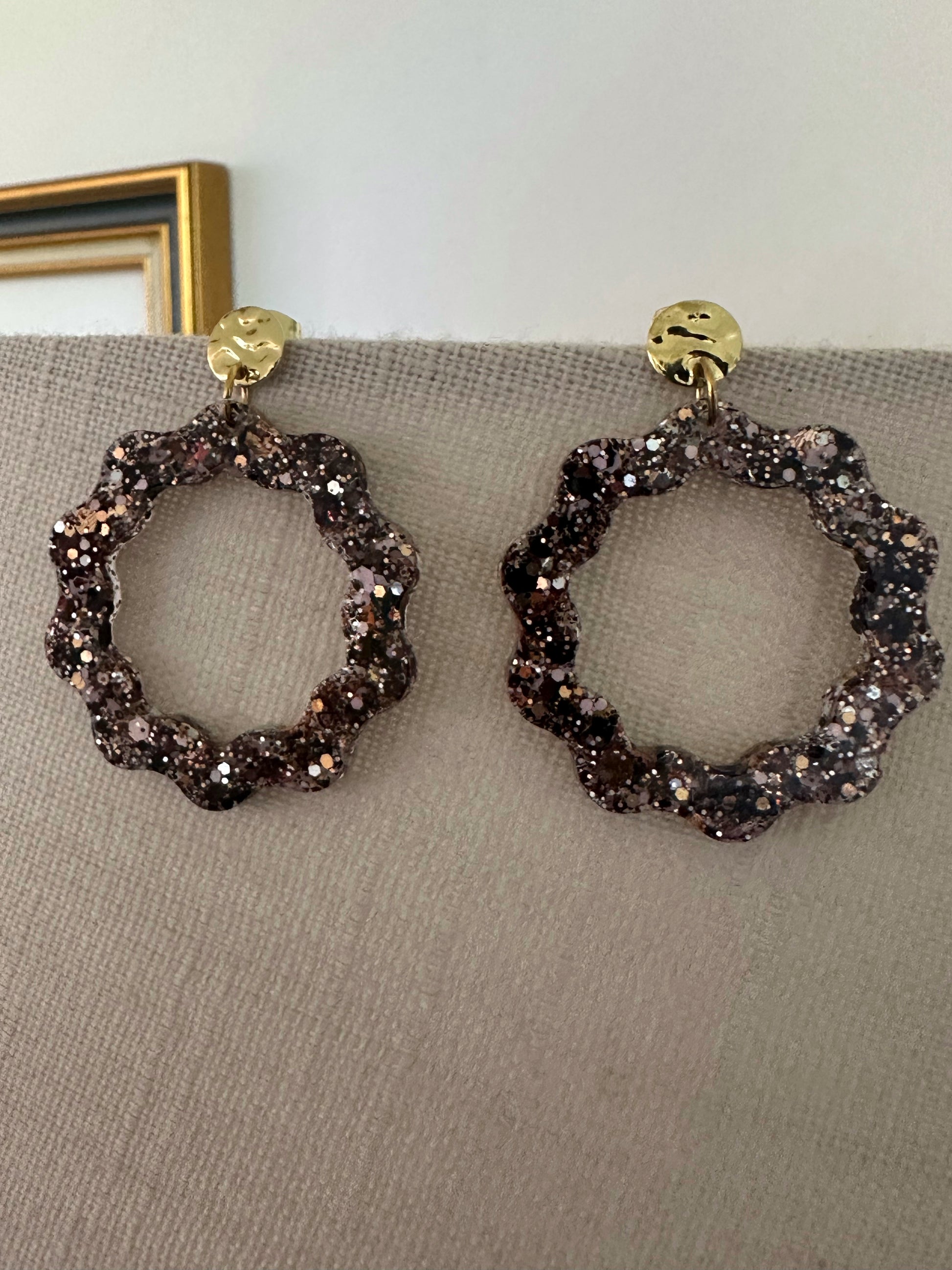 Ajoutez une touche de lumière à vos looks avec ces créoles uniques, entièrement faites main en résine. Chaque pièce est coulée avec soin, laissant apparaître de subtiles paillettes qui captent la lumière à chaque mouvement.